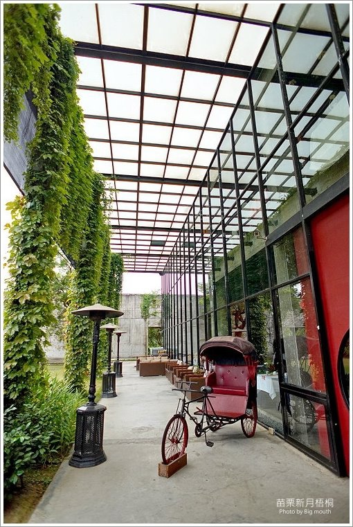 ▼挑高的主建築物看起來相當寬敞,也有一小區的戶外用餐及休憩空間,門口的一側還擺有一台復古的三輪車,相當有FU!