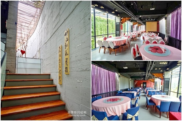 ▼沿著階梯拾級而上,二樓則是大圓桌,每個桌子轉盤上都有一朵大大的扶桑花,非常有苗栗的在地特色,這裡也很適合辦宴席或喜宴唷!