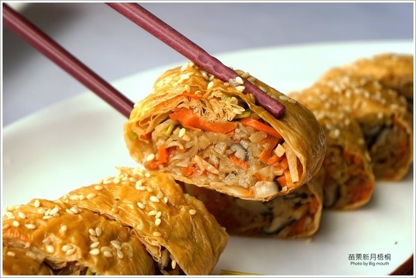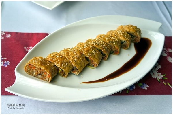 ▼沒多久,美味就上桌溜!前菜冷盤的煙燻腐衣捲,將筍絲、香菇絲以腐皮包起,煙燻而成,這道可是蔬食料理,但吃起來口感頗為豐富!