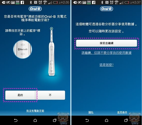 第一次進入要做的事就是讓手機和德國百靈Oral-B P7000 Platinum Black白金級電動牙刷配對,記得要開啟手機的藍芽,點選「是的」一下下的時間,就自動連線成功超方便的啦,連線成功後點選「接受並繼續」。