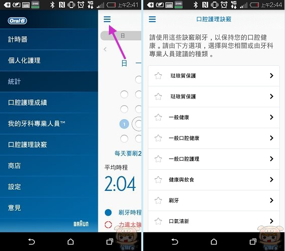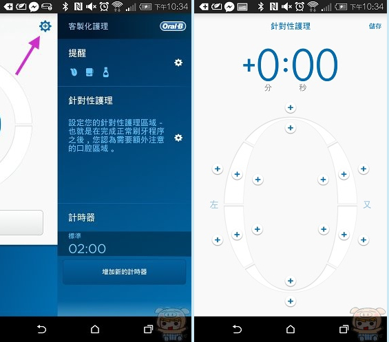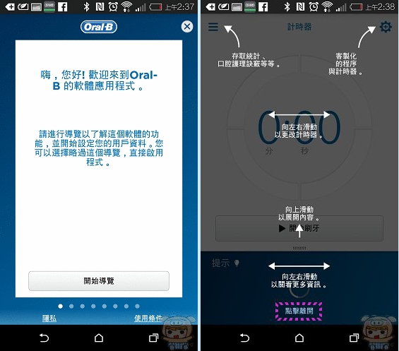 第一次進入Oral-B App裏,會有一些導覽與說明,左上方為存取統計、口腔獲理訣竅等等的選項,右上方為客製化的程序與計時器等設定選項。