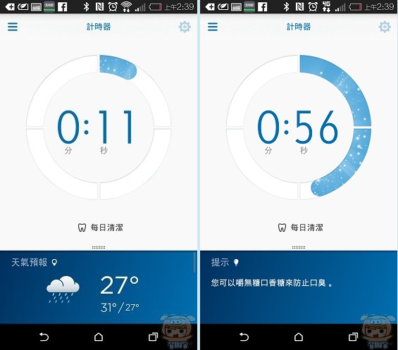 現在就要準備開始刷囉,當使用者開啟智慧型牙刷之後,手機裏的計時器也和無線智慧導航顯示器一樣,就會開始自動計時,同時下方也會出現新聞、天氣、牙齒保健等訊息,讓您刷牙的同時,也能獲得豐富的資訊。