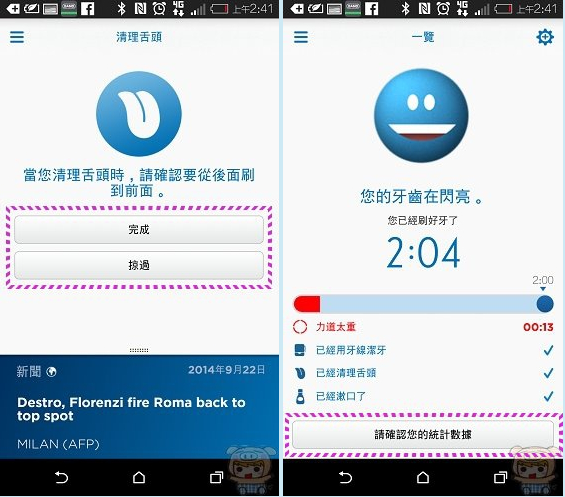 接著刷完牙後,後面也會有一些貼心的小提醒「清理舌頭」「牙線潔牙」「潄口」等。刷完後畫面會幫您計算出這一次刷牙使用了多少使用,力道太重的時間等。點選「請確認您的統計數據」。