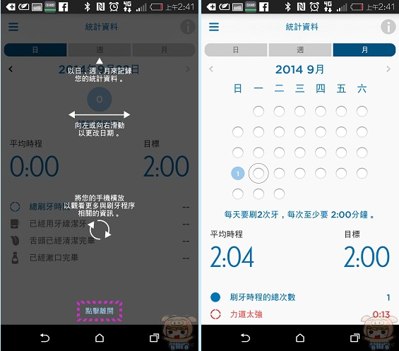 進入「統計資料」的頁面後,程式也會貼心的提醒您怎麼操作,如果過程中有問題的話,都可以點選右上方「i」查詢。統計資料以「日、週、月」來幫您統計您的刷牙資料,如此一來每半年到牙醫師檢查牙齒時,就可以透過此APP的潔牙記錄與醫師討論,針對平常的潔牙習慣去做改善。