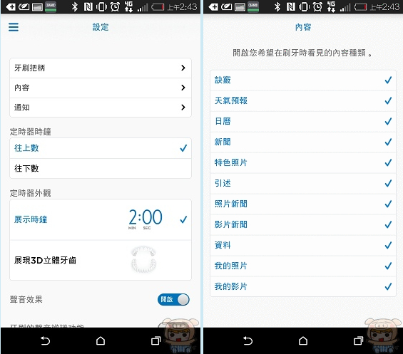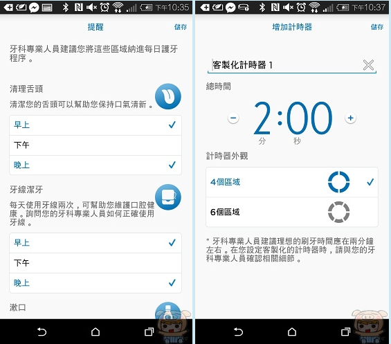另外就是每次刷完牙後,會有「清理舌頭」「牙線潔牙」「潄口」的提醒,也可以在這裏自行設定,還有就是計時器的時間也是可以個人客制化制定的。
