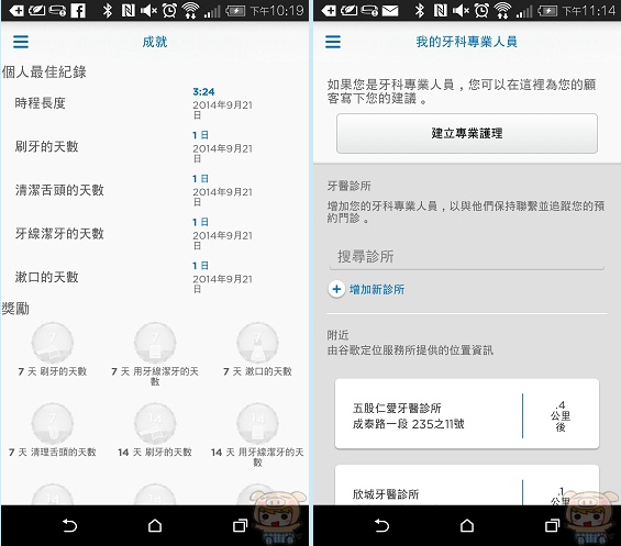 口腔護理成績裏記錄了個人刷牙的成就最佳紀錄、刷牙的時間、刷牙的天數、清潔舌頭的天數、牙線潔牙的天數、潄口的天數。我的牙科專業人員裏,提供了您附近的牙醫診所,同時也可以透過搜尋來快速找尋其他牙醫診所。