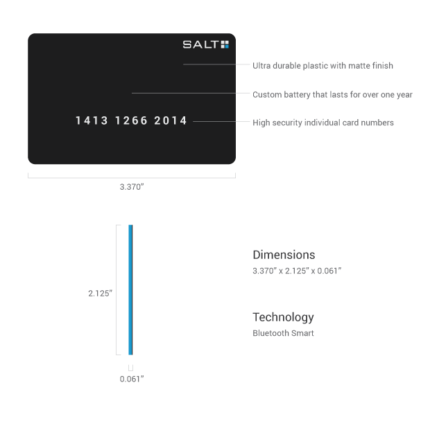 SALT Card 的解鎖卡片同一般信用卡的大小厚度,每張卡片都有專屬卡號,內建藍牙智慧電路版,其系統由 281億個組合成,安全性高,電力至少可使用一年。