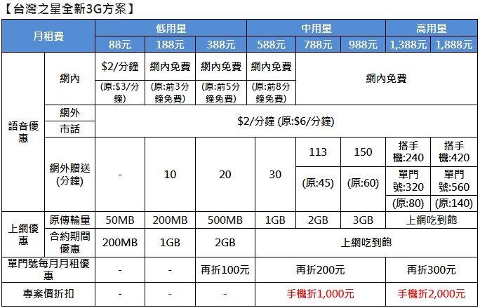 台灣之星全新3G資費 網外市話通通每分鐘只要2元