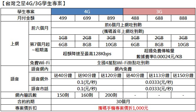 台灣之星的學生專案,平均月租比其他電信還便宜100元,學生申辦4G最低只要月付499元,合約期間共可省下3,000元,還可享受前6個月上網吃到飽;攜碼用戶申辦學生專案,上網吃到飽期限更從6個月延長至一年,手機再折1,000元。另外,吃到飽期限一年後的傳輸量,也比其他電信業者容量還大,每月都比同業多出0.5G~1G的傳輸量,同時再享網內通話免費。針對通話需求較高的學生族群,另有3G學生專案供選擇,同樣可享新3G網外/市話每分鐘只要2元優惠。