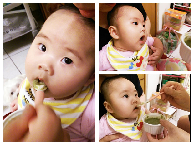 因為醫生說太晚給寶寶吃副食品,到時候可能小朋友已經很有個性了,會開始挑食或是只想吃自己喜歡的東西,可能會小排斥或不太好餵,所以我們就開始讓小恰咪接觸副食品囉!還好現在吃得狀況還滿好的。當然一開始不能直接給小朋友吃太大塊的東西啦!一來不好消化,一方面吞嚥上也有困難,所以我們會先把食物磨成細細的泥狀之後,再進行餵食囉!