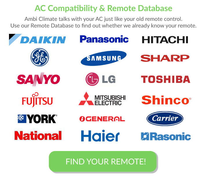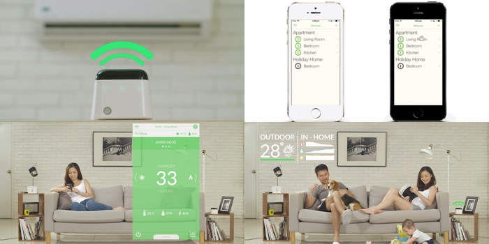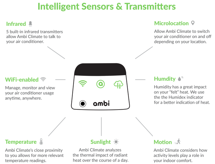 Ambi Climate 有五個紅外線收發器,連接空調並自動調整舒適度;追蹤用戶位置功能以開啟或關閉空調、WIFI、濕度管理、溫度感應器、高溫分析、用戶的活動指數。