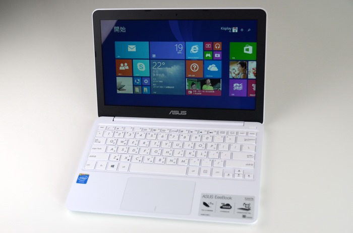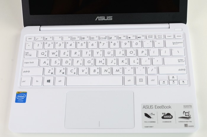 手邊的這台是ASUS EeeBook X205,螢幕大小為11.6吋,使用1366 x 768解析度顯示器,外觀規格為286 x 193.3 x 17.5mm,重量為980g,目前除了白色外,還同時推出金色、紅色與黑色。搭配2GB記憶體,儲存空間為32GB,雲端空間部分提供一年的ASUS WebStorage 500G,與1TB的OneDrive雲端儲存空間可使用。