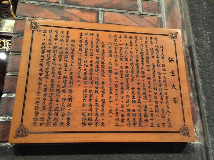 原來根據正殿旁的解說,保生大帝為中國閩南地區所信奉的醫神,俗稱”大道公”、”吳真人”或”花橋公”。再根據文獻記載,保生大帝為北宋閩南人士,本名吳夲(音韜),醫名頗盛。逝世後鄉人私諡為 “醫靈真人”,供奉為地方神祇,於白礁建廟奉祀。等到 1150 年宋高宗頒詔賜名為 “慈濟宮”。