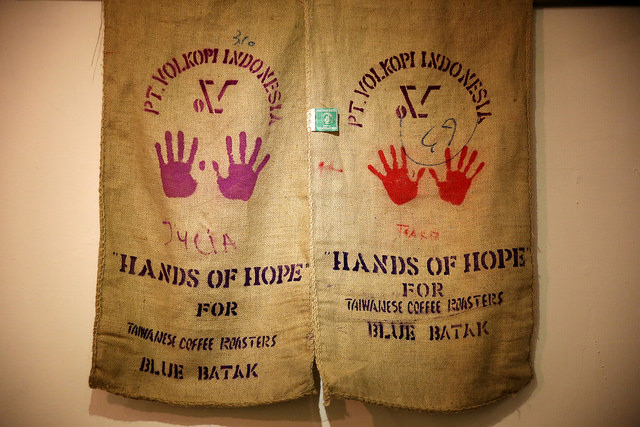 印尼 BLUE BATAK 的咖啡生豆麻布袋,上面的希望之手掌印讓人感受到咖啡小農的辛苦。