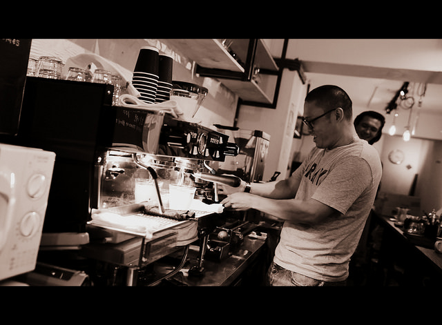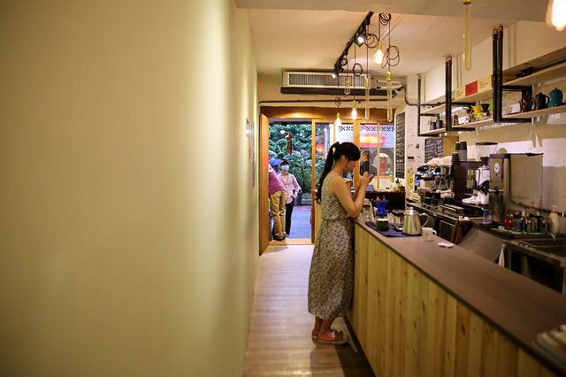 COFFEE : STAND UP 店內的空間屬於狹長型的,看起來應該房東是把原來的店面隔成一半再出租,藉此拉高出租金額,這招最近在台北越來越常見。在這個狀況之下,建構起吧檯空間後,就只剩下堪容兩個人擦肩而過的走道,要放椅子就有困難了。