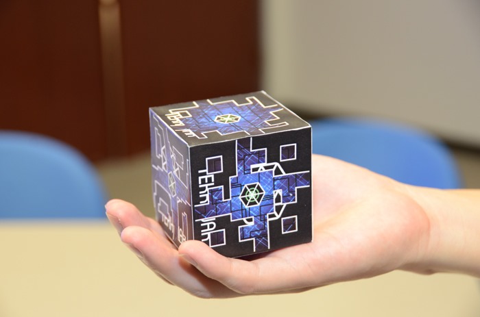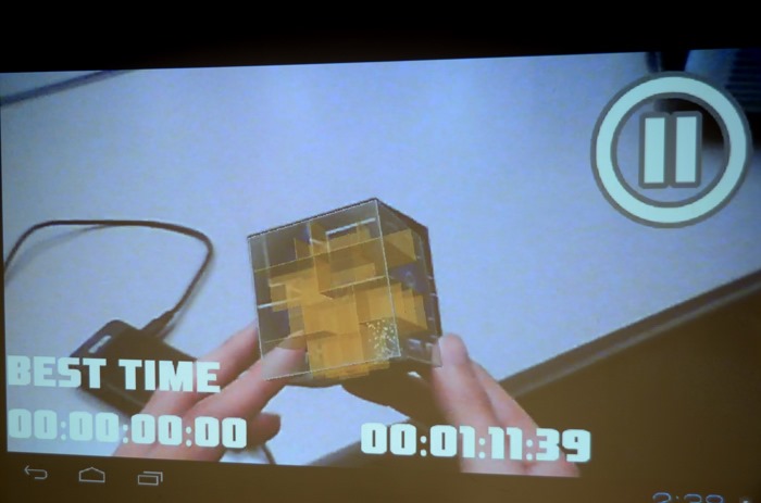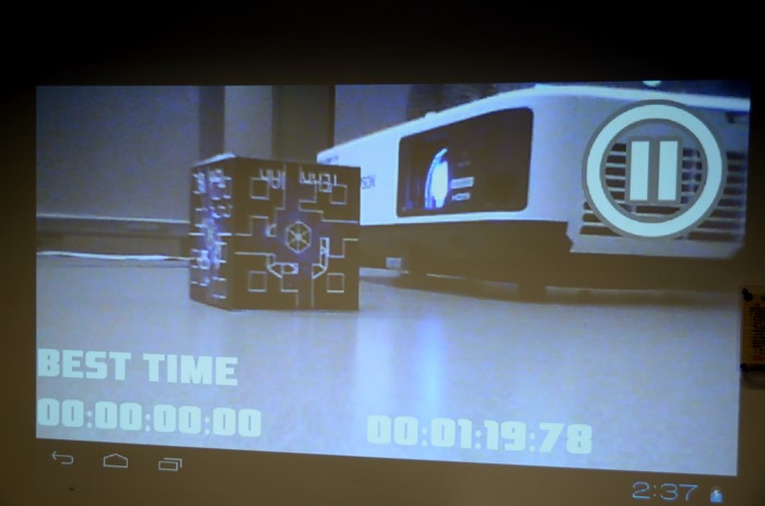 而擴增實境功能,是BT-200中最具特色的功能之一,EPSON與APP開發者藉由這樣的方式開發出許多有趣的軟體,例如手中這個立方體,投過BT-200後,就變成了一個立體迷宮。