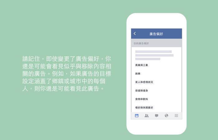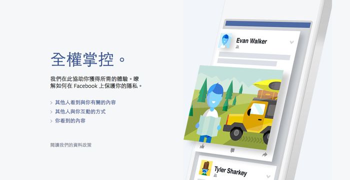 “…… 我們推出隱私相關基本資訊,提供您如何主導 Facebook 體驗的提示和使用指南。我們也將更新本公司的條款、資料政策和 Cookie 政策,以便反映我們一直以來致力開發的新功能,讓這些內容淺顯易懂。 而且我們將根據您在 Facebook 之外使用的應用程式和網站(線上行為廣告)來導入廣告改善,並給予您控制權。