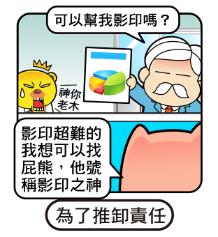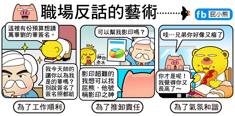 屁小熊 2014/11/25瀏覽: views 反話的藝術~職場必學技能!用的好順順利利,當然用不到,或沒學到精髓的話還是會樹立不少敵人啦,請甚用~~ 有時說點反話可以達到讓工作預算過關的機率增加不少呀~~~ 多一事不如少一事,能推就裝傻,裝做不會,有時過的了關,但有時別像漫畫裡,還陰了同事,這可能會導致同事間的小戰爭啊… 有時說點反話可以增進公司內部的氣氛和諧,讓大家可以在開心的氛圍下工作這不是挺好的嗎? 好啦以上其實多少加了點亂畫的成份在,但也是讓大家開心點~畢竟這些狀況還真的在職場都會遇到的唷! 由屁小熊的小冊日記貼文。 由屁小熊的小冊日記貼文。 Related Items屁熊內褲豬職場搞笑漫畫說反話 圖文觀點 2014/11/25瀏覽: views 屁小熊 愛分享上班搞笑的屁熊還有內褲豬,職場不開心的話就快來找我們 ■作者:屁小熊 ■主題:職場、漫畫、生活、搞笑 ■個人網站:https://padbear68ee07.blogspot.com/ ■FB粉絲團:https://www.facebook.com/ppbear123 ■連絡方式:197968ee07@gmail.com Related Items屁熊內褲豬職場搞笑漫畫說反話 next page