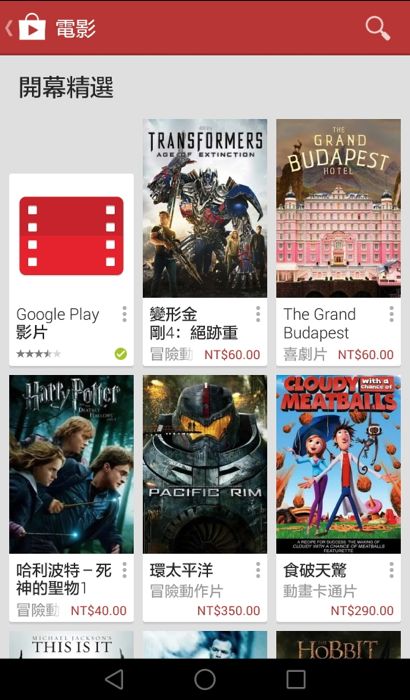 只要登入 Google Play 商店就能看到開幕精選中有著 Google Play 影片的應用程式在其中,而旁邊列出的就是目前支援著 Google Play 影片的電影,其中使用者可以選擇要用租借的或是購買的方式來進行欣賞,影片更是包括了最新的變形金剛、哥吉拉… 或是