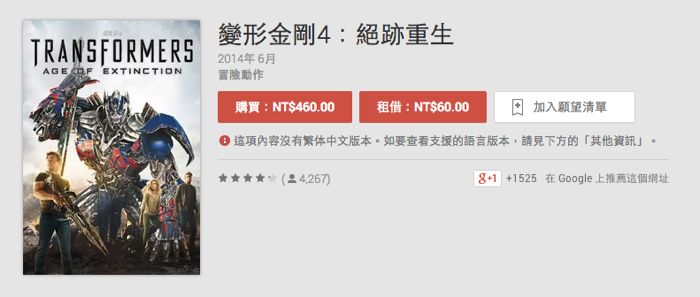 在 Google Play 影片中挑選了有興趣的影片時可以發現有分為租借的金額與購買的金額,其中還會再分要標準畫質或是高清畫質而價格有所不同。不過這邊有兩點要特別注意的,就是如果選擇租借,那麼使用者必須於 30 天內開始觀看,並且在開始觀看後 48 小時內看完。另一個就是字幕的部分,如果是有需要依賴繁體中文的朋友,也要在一些新的片子中特別注意一下,因為有些片子還來不及支援繁中字幕喲!