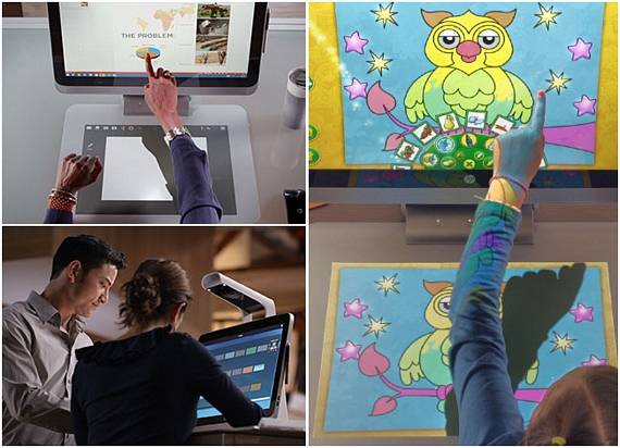 這款 HP Sprout 透過上方的 3D 掃描感應器、 23 吋觸控螢幕和觸控桌墊來將實體的物體、書本文字等掃描進電腦中或是能將電腦中的畫面圖案截取下來,拉到桌面上的觸控墊板上來進行繪圖操作。