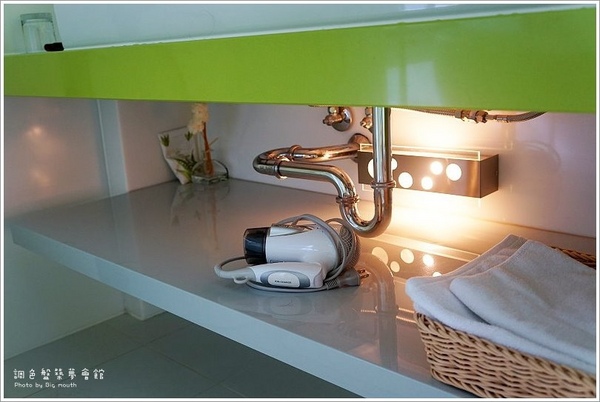 ▼洗手台下方則放有負離子吹風機及毛巾組,大家都知道大口很注重吹風機是掛壁式的還是一般手拿的,這裡不但是手拿的且還是負離子的,對女孩兒來說頭髮會吹得很快又非常柔順,真是大大加分啊!
