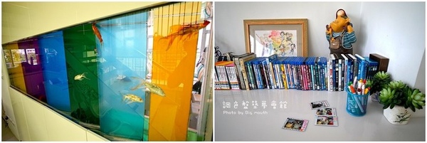 ▼這裡連魚缸都是彩色的,魚兒就在這一片片繽紛的隔板中悠游自在,非常特別!另外大廳還有提供不少影片,都可以來這邊租借唷!民宿主人最後也會幫忙拍立可拍,都可以在這裡使用桌上的畫筆塗鴉留念,是個賓主盡歡的美好回憶!