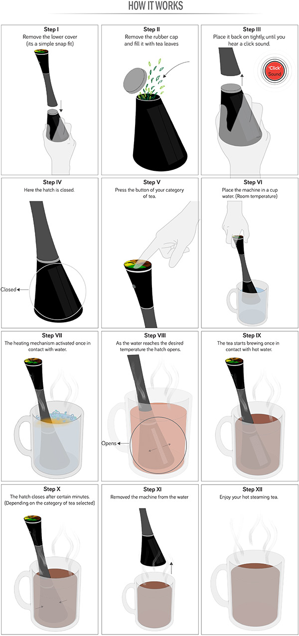 它是如何運作的呢?首先打開Mychai,放入茶葉在底部的收集盒,再把Mychai栓緊,視茶葉種類按下頂部按鈕,放入注1-2杯水量的杯子中,Mychai會以預設溫度把杯內的水加熱,底部的絲網會讓加熱使熱水沖到茶葉,待茶水均勻成色後,便能取出Mychai,享受最佳茶味的咖啡。