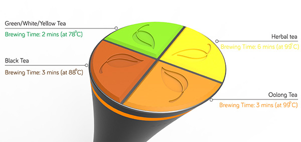 在茶具的頂端有四種選擇鍵,側邊的LED燈會依照選擇模式顯示,以红茶、绿茶、黑茶、草本茶等都各有建議溫度的設定。