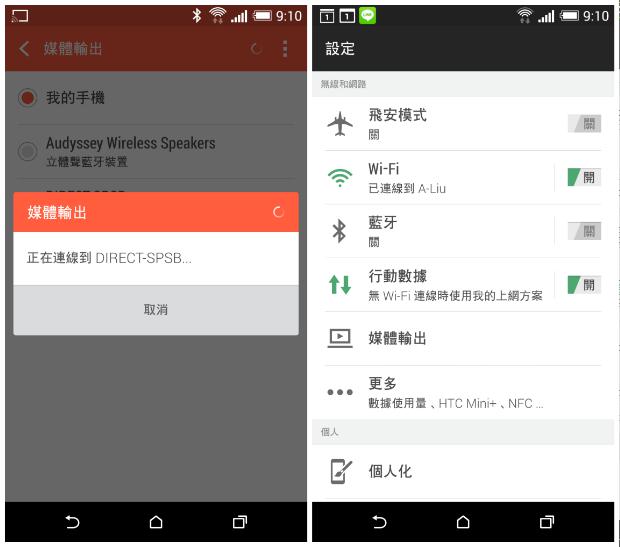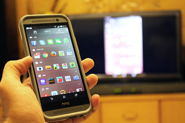 即使家裡沒有網路,我們一樣可以透過 Wi-Fi Direct 或 Miracast 的方式進行無線投影。小恰這裡直接先用 HTC M8 來測試給大家看,直接在手機選擇媒體輸出,偵測到裝置後,手機畫面就可以直接投影在電視上,這就是超好用的 Miracast 功能!