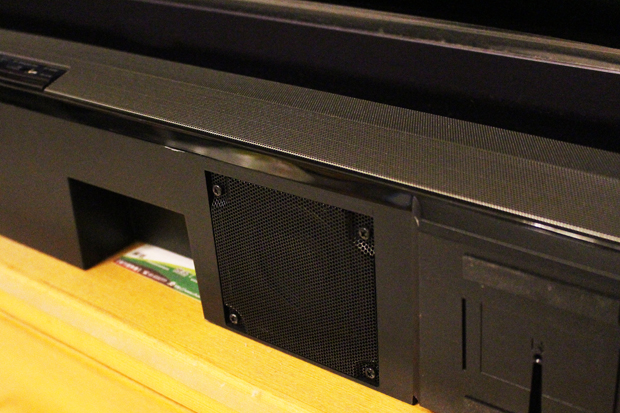 其實 Sound Bar 底部左右兩側,各還有一個重低音單體設計。根據官方介紹是藉由流體力學而設計的架構,可以降低各種雜訊干擾,提供一個很棒的低音體驗。