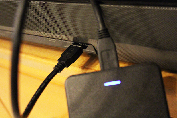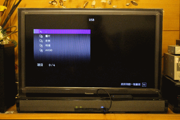 平常我們把照片影片存在隨身碟,也可以用 Sound Bar(SBX-N700)來播放存放在硬碟中的媒體檔案,從前面插上去就可以了,很簡單。