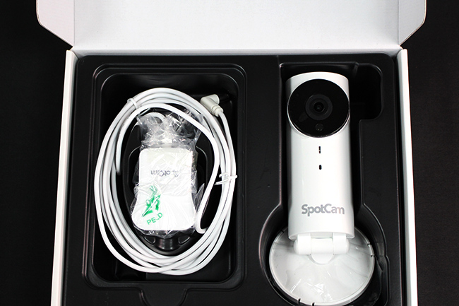 SpotCam 在硬體方面的幾項特色都標示在盒上,有 HD 720P 高清解析度的影像、110 度廣角、無線 WiFi 功能、紅外線夜視、雲端監控以及雙向語音等功能,這等等都會來試用給大家看!打開箱子你會發現就是這麼簡單,除了 SpotCam 主機本體之外,其他就是 3 公尺的電源線、說明書和牆上安裝套件這樣而已。