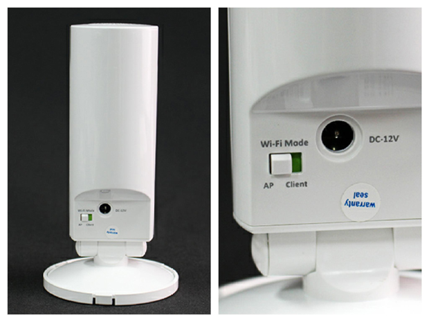 背面只有個電源插孔和網路模式切換鈕,一開始設定時先用左邊的 AP 模式,藉由 SpotCam 的軟體設定好需求之後,再切換成 Client 模式就可以使用了,而且只需要用「這一次」而已,有夠簡單。