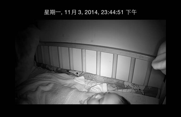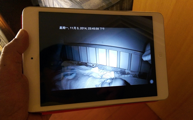 另外可能很多人會擔心在夜間會不會看不清楚,這裡 SpotCam 在光線不足的狀況下,會自動開啟紅外線 LED,黑暗中也會有清晰影像唷!就算晚上在公司加班(淚),也能清楚看到小朋友睡著的狀況。