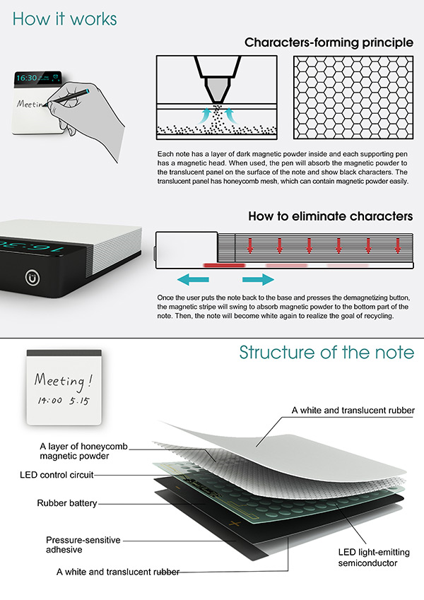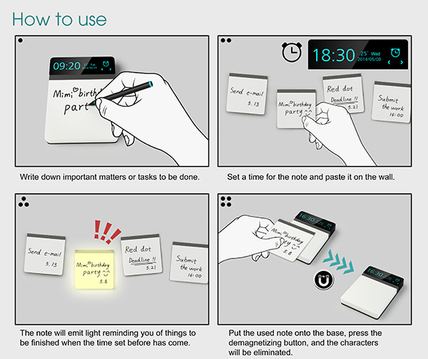 使用時在磁鐵板寫下記事,在基座設定好通知時間,就像鬧鐘一樣。當時間到時,便條會亮起以提醒你! 使用完畢後把便條消磁就可以清除字了,可持續重覆使用,相當環保。這目前還只是概念產品,期待它量產,最好也能搭配手機遠端遙控書寫就更酷了呀!