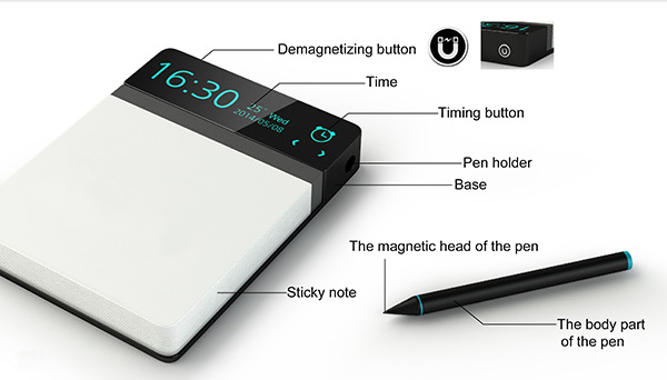 這組便利貼有磁鐵塗鴉板,有數片可取下書寫,附一支磁性筆書寫。基座上有消磁鍵、時間設定鍵。