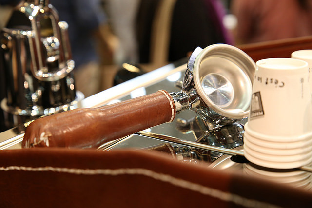 薑是老的辣,這台單孔拉霸式咖啡機的嶄新皮革外裝,是維堤咖啡的張宣安大哥,特別為了這次展覽連夜親手縫製出來的,非常有質感啊!好想把它搬回家。