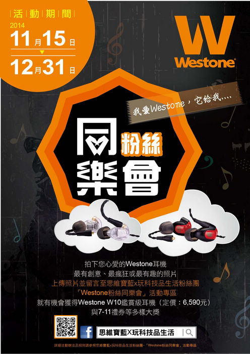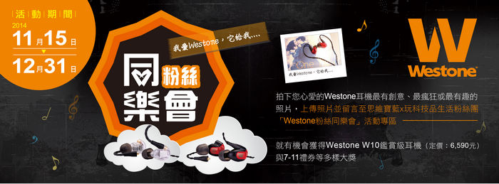 自2014年11月15日至2014年12月31日止,只要拍下您心愛的Westone耳機最有創意、最瘋狂或最有趣的照片,上傳照片並留言至思維寶藍x玩科技品生活粉絲團的「Westone粉絲同樂會」活動專區,就有機會獲得Westone W10鑑賞級耳機(定價:6,590元)與7-11禮券等多樣大獎。