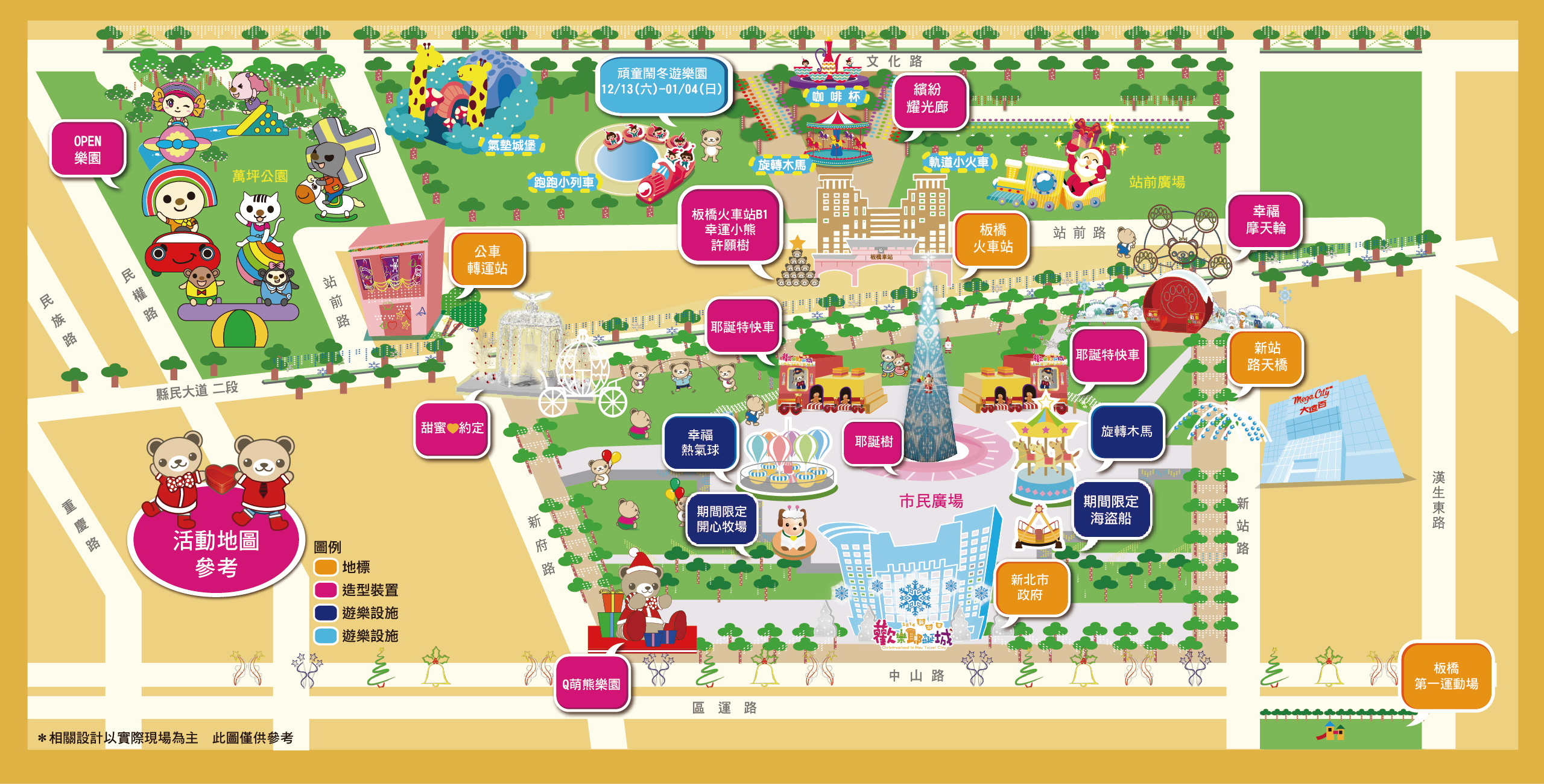 底下也設定好燈海地圖,可以直接點連結放大看,或是在官網看動畫版本。燈海最特別是在板橋車站後的七彩「繽紛耀光廊」,很像一道道彩虹,超級美麗。另外萬坪公園也會有「OPEN樂園」,主燈區的遊樂場有四樣設施,充滿雪花星光閃閃連接大遠百的「新站露天橋」都很值得拍照。