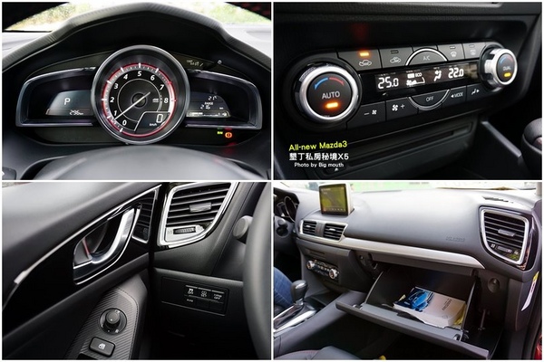 ▼ 儀板表設計的較為運動風,中央圓環轉速表特地採用金屬與紅色飾條作搭配,看起來更為年輕時尚,右下角的車速資訊以數位液晶方式顯示,感覺簡單醒目;兩旁延 伸下去如副翼的區塊則是以液晶螢幕來顯示其他行車資訊!空調方面,提供雙區恆溫系統,分別照顧駕駛者與前座乘客的不同溫度需求,像是口咩比較怕熱,就可以 自行調整較低溫度,在設計上更為貼心!另外,副駕駛座的手套箱空間也不小,可以收納的空間更為寬廣多元!