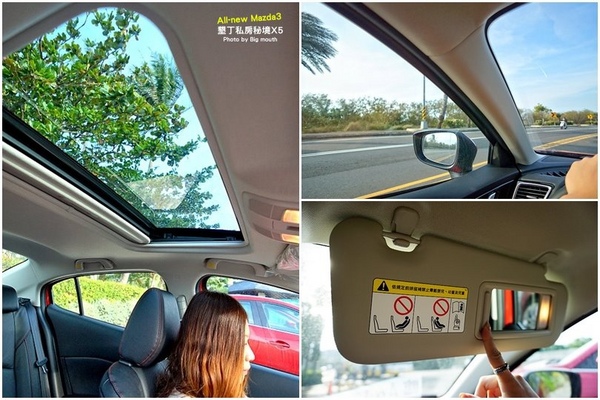▼All-new Mazda3的A柱較2代車款後移了100mm,對駕駛來說視野提升了不少,也比較沒有壓迫感;另外想看風景的話也可以將天窗打開,只要輕輕一按,就能自 由的開啟或關閉!副駕駛座的擋陽板背後更有化妝鏡及照明燈,只要一打開鏡子照燈就會亮,讓女孩兒在晚上想要偷偷補妝的話也沒有問題囉!