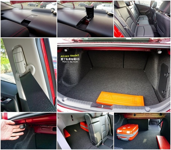 ▼ 且All-new Mazda3的後座座椅皆配備了兒童安全座椅鎖扣,所以要載小朋友出遊也相當便利唷!後座行李廂空間完整平坦,足足有414公升大,最多可以放到三個24 吋行李箱,像大口這次到墾丁出遊帶的20吋小紅行李箱放在後車廂感覺空間還綽綽有餘呢!後座座椅一樣可以六四分離,只要輕輕一拉,即可將座椅往前推,可以 存放的空間就更大了!