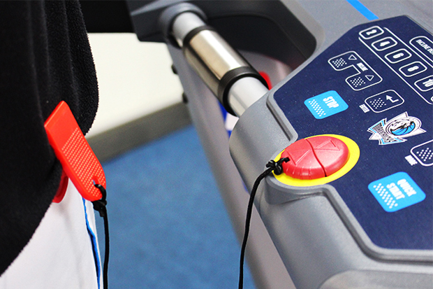 像我不小心跑出去,扯開了扣繩後,跑步機就會進入安全模式,停止高速的跑動。