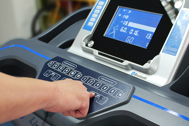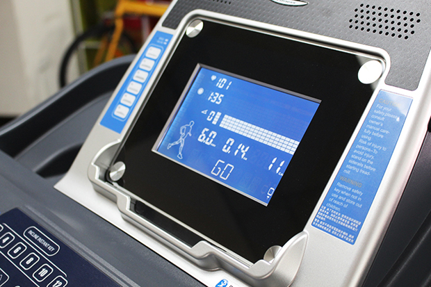 跑步機面板的部份也很有型,採用科技藍背光的 LCD 螢幕,上面可以看到我們的訓練部位(人體圖示)、顯眼的大字體顯示以及心律等資訊,下方還有一個可以放置平板電腦的凹槽設計(這部份後面會來跟大家介紹)。