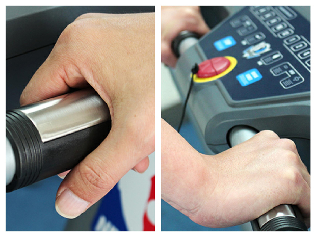 那要怎麼偵測心跳值呢?主要是藉由這個位於面板下方的手握心跳感測裝置了,搭配內建的 3 组的 HRC 心跳監控程式,讓我們能夠隨時掌握跑步的步調和身體的狀況。