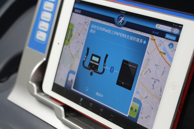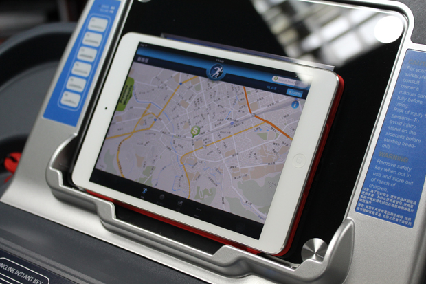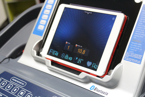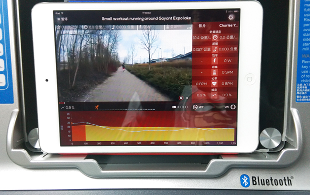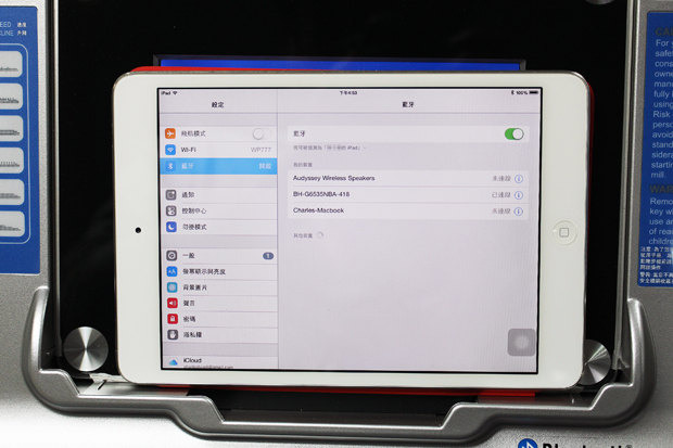 在啟用 App 前,可以先讓你的平板電腦和跑步機做藍牙的連線。恰爾斯自己常用的是 iPad mini,這個面板立架放個大台的 iPad 也沒有問題啦!而且跑的時候也很穩,根本不會晃動,密合度做得很好。