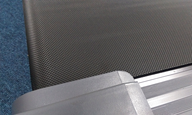 在跑道的部份,有這個最長避震膠條(K-Dumper),最主要目的就是保護我們的雙腳,根據官方說法是藉由流動體力學的設計,均勻分散我們在跑板上的壓力,降低每一步的反作用力,維持跑步機的平衡。所以跑的過程中都能這樣穩健的前進,不會有不平衡的狀況。