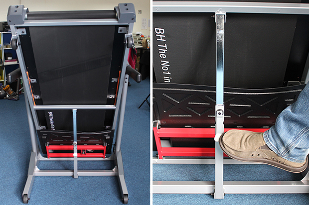 像是最近外面的天氣真的是又冷又下雨的,簡單在家裡或辦公室打造一個自己的 HomeGym,就不用跑去健身房跟人搶跑步機啦!而且 BH 跑步機在收納的部份也很有一套。簡單將跑道後端抬起來,因為有 SDS 兩段式全緩降系統,所以無論是抬起來或是放下去都有壓力棒的緩衝,不會壓傷人或傷到家裡的裝潢。