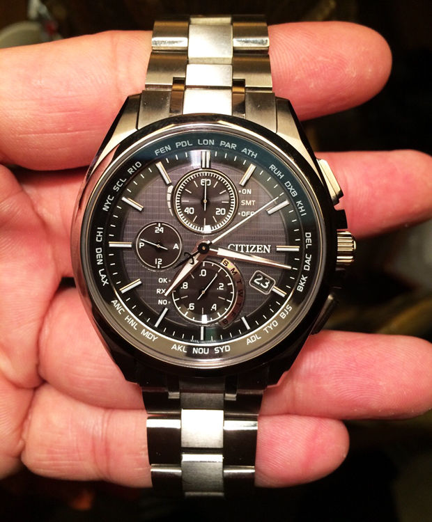 好啦!不要亂畫了。除了剛剛展示的精緻外型外,內在的功能和使用性上也都很不錯。像恰爾斯的老弟是戴 CITIZEN AT8044-56E(參考網址)的那個錶款,同樣是有光動能、全球電波功能和 DLC 的高耐磨處理,恰爾斯自己也把玩過。